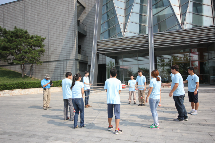学员们在教练的指导下练习拓展项目“龙行天下”